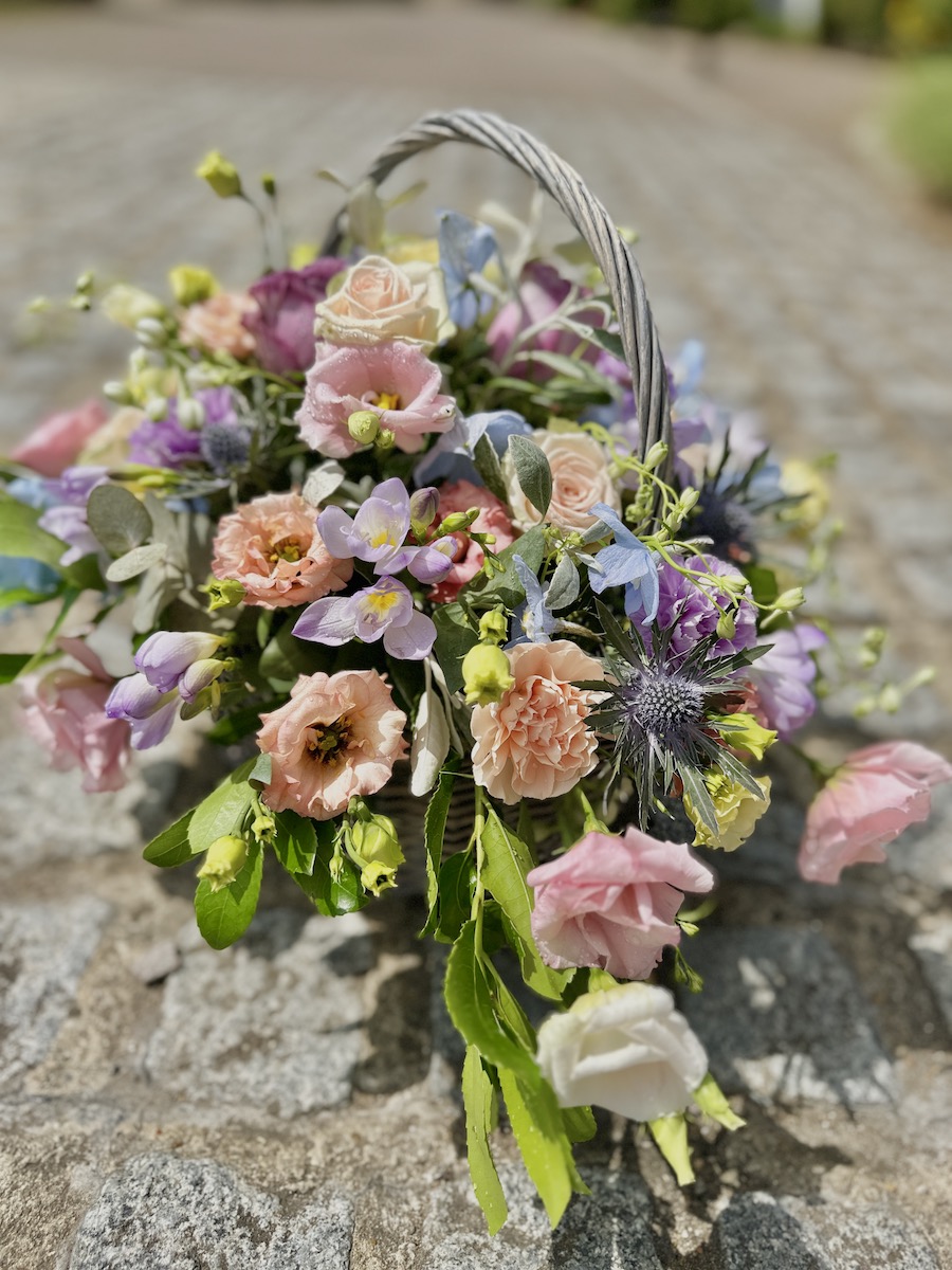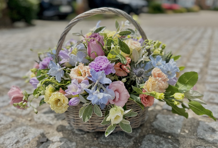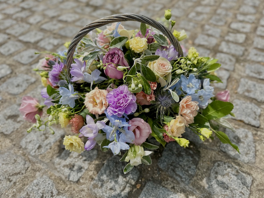 This pastel basket is created in Oasis, a water retaining foam, so the flowers will last well without needing to go into a vase. It can also be taken from the funeral to a wake due to its ease to carry.
